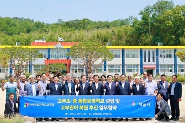 정읍시와 전북도교육청은 18일 고부면 동학울림센터에서 ‘고부초·중 통합운영학교 설립 및 고부관아 복원사업’을 위한 업무협약(MOU)을 체결했다. 고부초를 인근 고부중학교 부지로 이전해 초·중 통합학교로 새롭게 출발하고, 기존 학교 용지는 고부관아 복원지로 활용하는 내용이다.