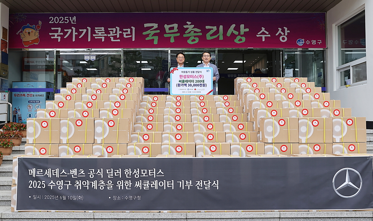 한성모터스는 지난 6월 10일 부산 수영구청에서 여름철 폭염에 취약한 이웃들을 위한 써큘레이터 200대(총 3천만 원 상당)를 기부하며 2025년 여름 맞이 이웃돕기 성품 전달식을 진행했다고 19일 밝혔다.