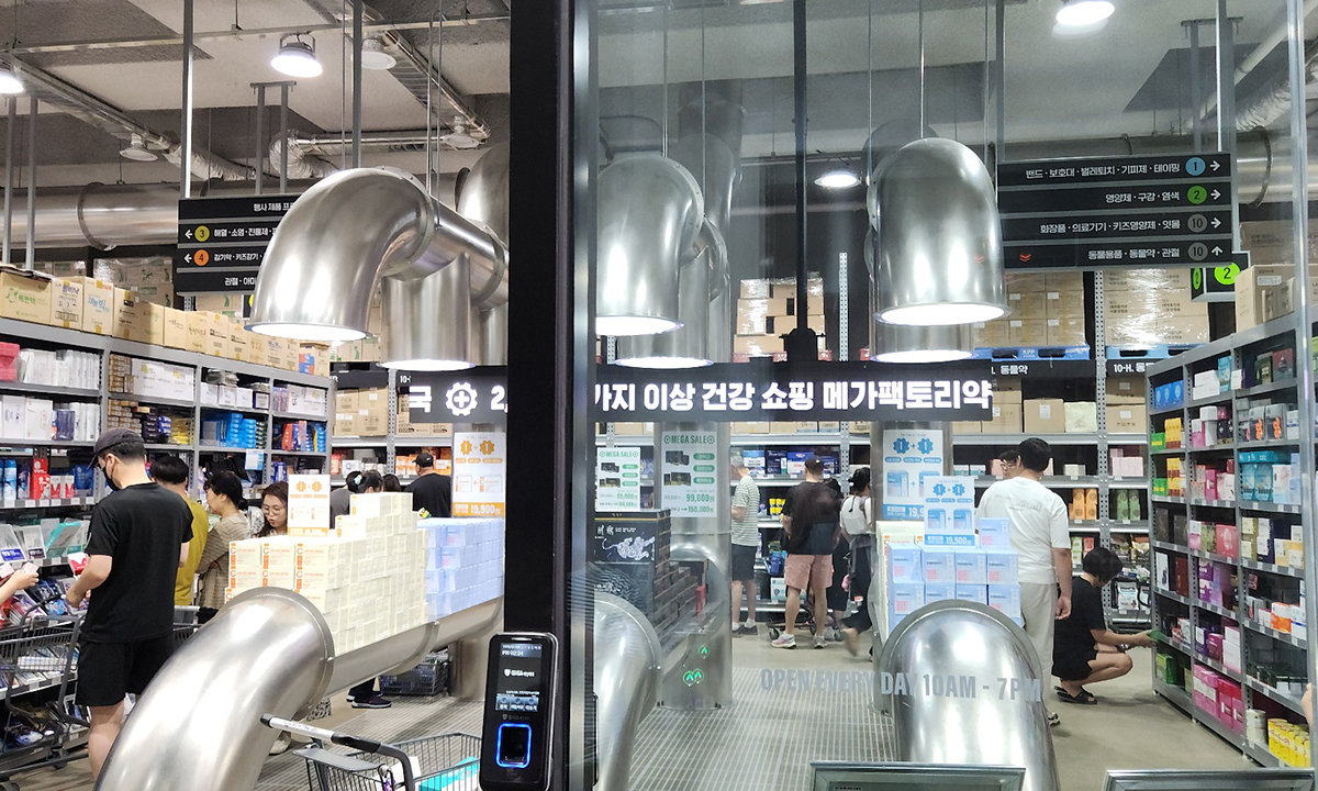 매장 관계자는 “미국의 창고형 약국(드러그스토어)을 벤치마킹했다”며 “급격히 방문객이 늘어 직원을 계속 뽑고 있다. 하루 매출은 대외비”라고 설명했다. 개장 직후 10여명에 불과했던 매장 방문객들은 입소문을 타며 폭증하고 있다. 이날도 계산대까지 100m 넘게 대기 줄이 늘어섰고, 매장 안에만 300명 안팎의 사람이 머물렀다. 매장 측은 이곳 제품들이 인근 약국보다 대부분 싸지만, 일부 비싼 품목도 있다고 밝혔다.