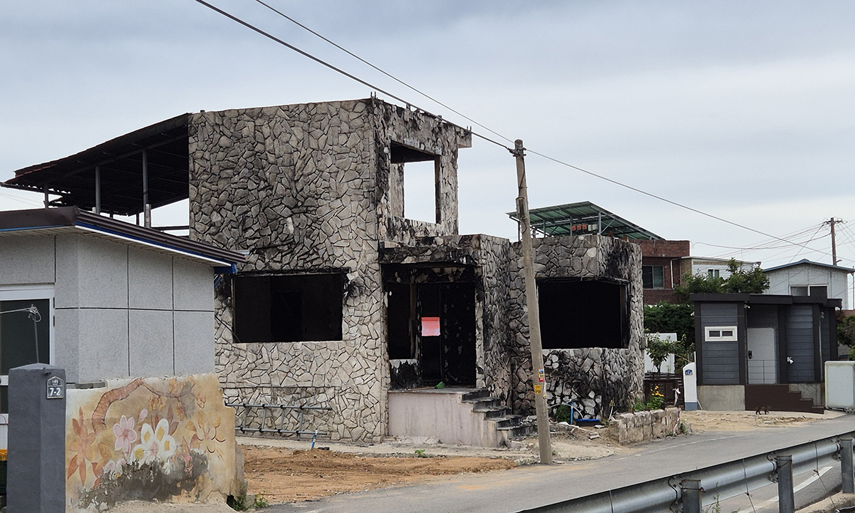 김 이장과 함께 둘러본 노물리는 입구에서부터 마을회관까지 마을 곳곳에 화마의 상흔이 그대로 남아 있었다. 노물리는 산림으로 둘러싸인 골짜기 형태의 마을인 동시에 민가 바로 뒤에 야산이 위치한 만큼 산사태 우려가 특히 커 보였다. 줄지어 자리한 민가 양옆을 따라 능선이 있었고, 능선 위 나무는 산불로 검게 변했거나 뼈대만 앙상하게 남아 있었다. 그 아래로는 산불 이재민들이 거주하는 임시주택들이 보였다. 불에 타버린 주택이 철거된 터에는 녹색 잡초가 무성하게 자리하고 있었다.
