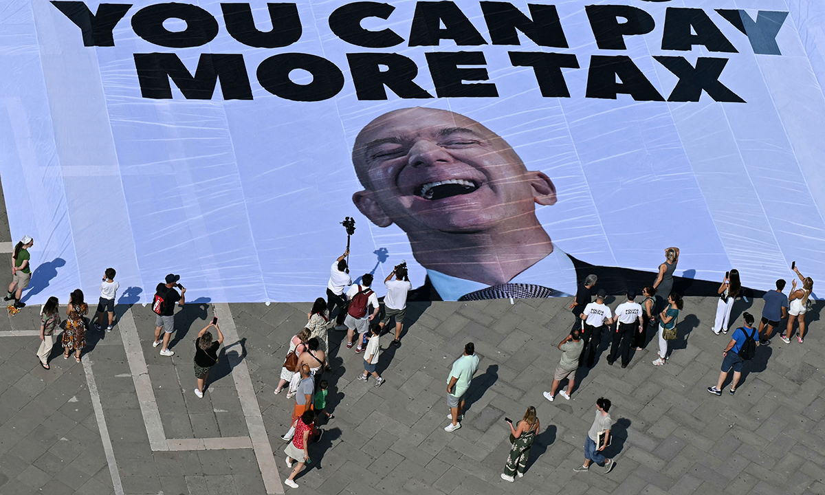 23일(현지시간) AP통신에 따르면 그린피스 소속 활동가 등 6명은 베네치아 산마르코 광장에 베이조스의 웃는 얼굴과 함께 “베네치아를 결혼식장으로 빌릴 수 있다면 세금을 더 내라”라는 문구가 적힌 현수막을 펼쳤다.
