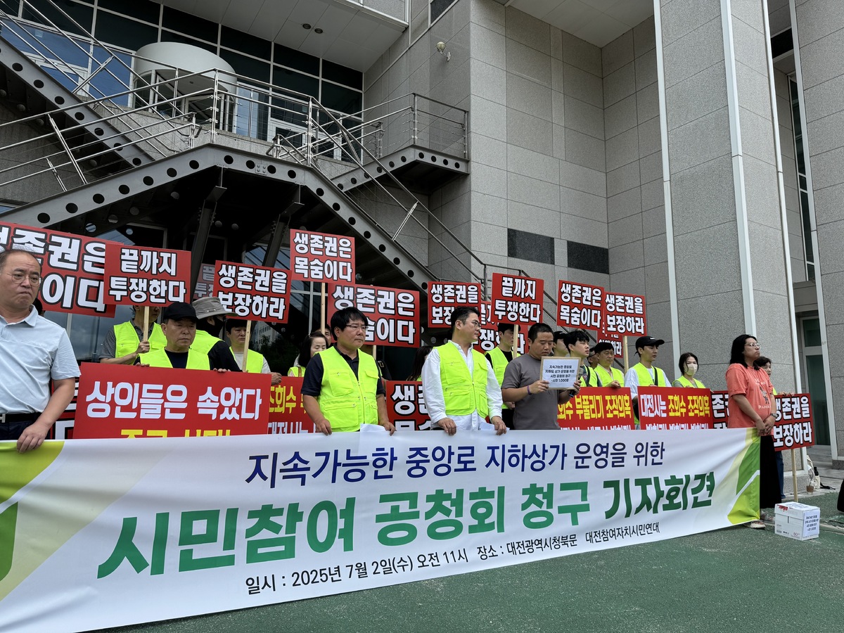 김재섭 대전참여연대 사무처장은 “원도심 상권의 거점이었던 중앙로지하상가는 지난해 대전시의 일방적인 운영 방식 변경으로 극심한 혼란을 겪고 있다”며 “대전시 시민참여조례에 근거해 중앙로 지하상가의 지속가능한 활성화를 위한 시민 참여 공청회 개최를 청구한다”고 말했다. 김 처장은 이어 “이장우 시장이 내건 ‘시민을 우선하는 시정’ 원칙을 행동으로 보여줄 때”라며 “대전시가 소통과 협치를 한 단계 발전시키는 계기로 삼길 바란다”고 강조했다.