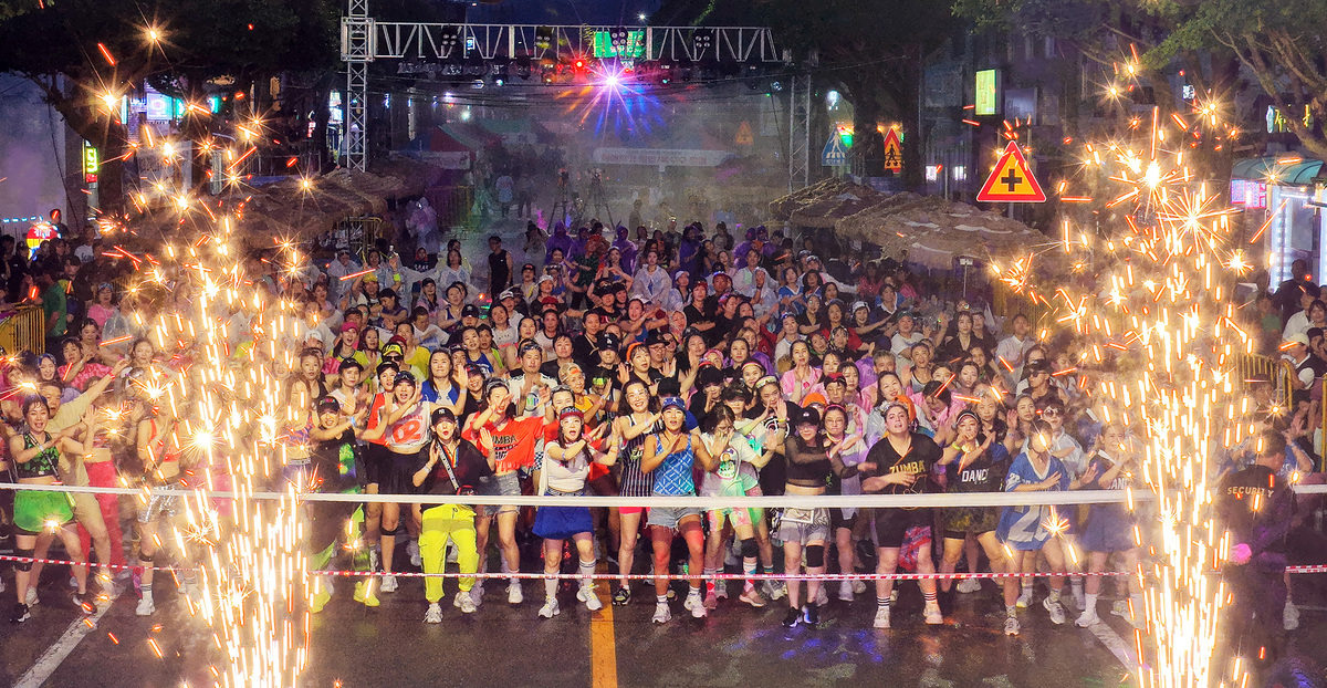 6일 강원 평창군 진부면 시가지에서 열린 제2회 오대산천 줌바경연대회 참가자들이 시원한 오대천 청정수를 워터밤처럼 맞으며 줌바댄스를 즐기고 있다. 올해 행사에는 국내외 40여 개 팀이 참가해 축하 공연, 경연, DJ 파티타임, 마스터클래스 줌바시연 등을 펼친다.