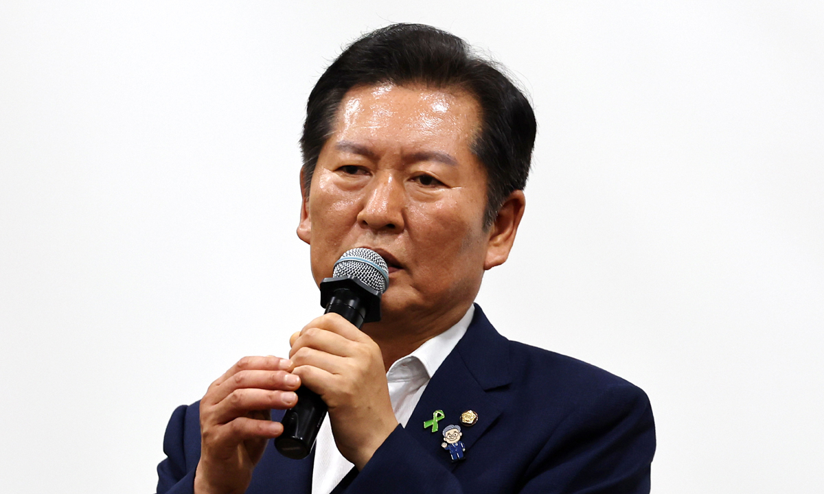 6일 오후 광주 서구 김대중컨벤션 센터에서 열린 ‘국민이 지키는 나라’ 북콘서트에서 더불어민주당 대표 선거에 출마한 정청래 국회의원이 발언하고 있다. 광주=연합뉴스