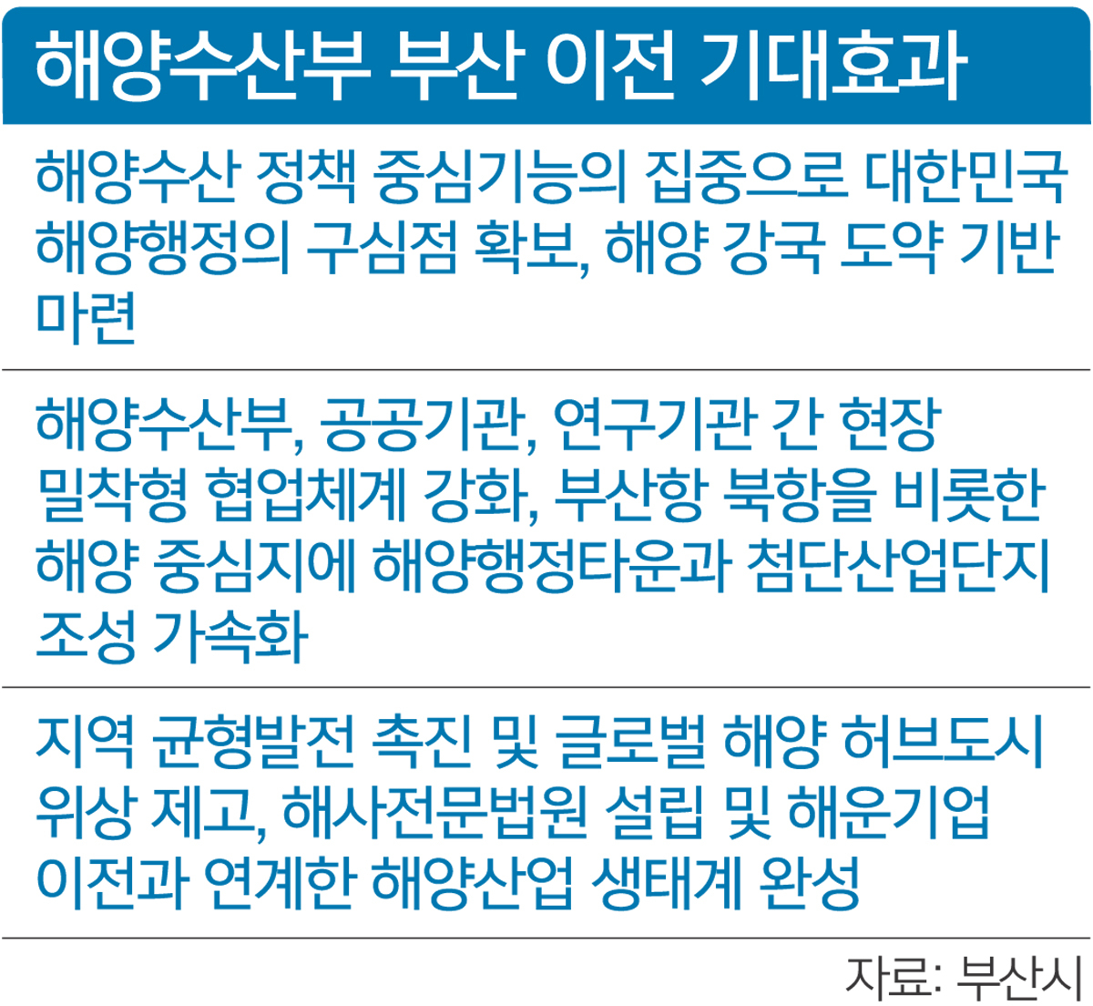 시는 해수부가 부산으로 이전하면 해양수산정책 중심기능의 집중으로 대한민국 해양 행정의 구심점을 확보하고, 해양 강국으로 도약을 위한 기반을 마련할 수 있을 것으로 기대하고 있다. 또 해수부와 공공기관, 연구기관 간 현장 밀착형 협업체계를 강화하고, 북항을 비롯한 해양 중심지에 해양행정타운과 첨단산업단지 조성이 가속화할 것이라는 전망이다. 박형준 부산시장은 “세계 2위 환적항이자 7위 컨테이너항인 부산항을 기반으로 우수한 항만 경쟁력을 갖춰 명실상부 해양수도로 거듭나 글로벌 해양걍국으로 도약할 것”이라고 말했다.