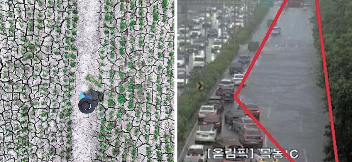 폭염이 지속되고 있는 제주 서귀포시 하논분화구 내 논바닥이 8일 쩍쩍 갈라져 있다. 오른쪽은 이날 오후 서울에 갑작스러운 폭우가 내리면서 목동 IC 인근 도로가 침수된 모습. 서울도 한낮 폭염이 이어졌으나 오후 기습 폭우로 구로구 고척동 아파트 단지와 양천구 목동교 인근, 양화대교 인근 등 일부 도로가 침수됐다.