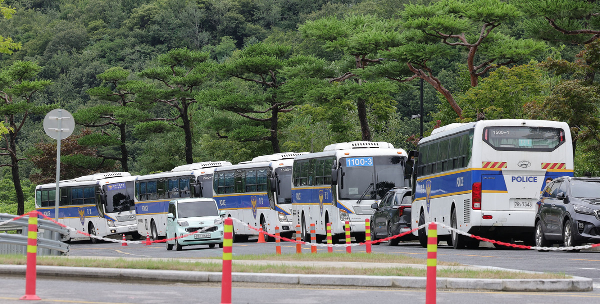 윤석열 전 대통령의 부인 김건희씨 관련 여러 의혹을 수사하는 민중기 특별검사팀이 ‘건진법사 청탁’ 의혹으로 통일교 시설 등을 압수수색한 18일 경기 가평군 천원궁 입구에 경찰 버스가 줄지어 서 있는 모습. 가평=이재문 기자
