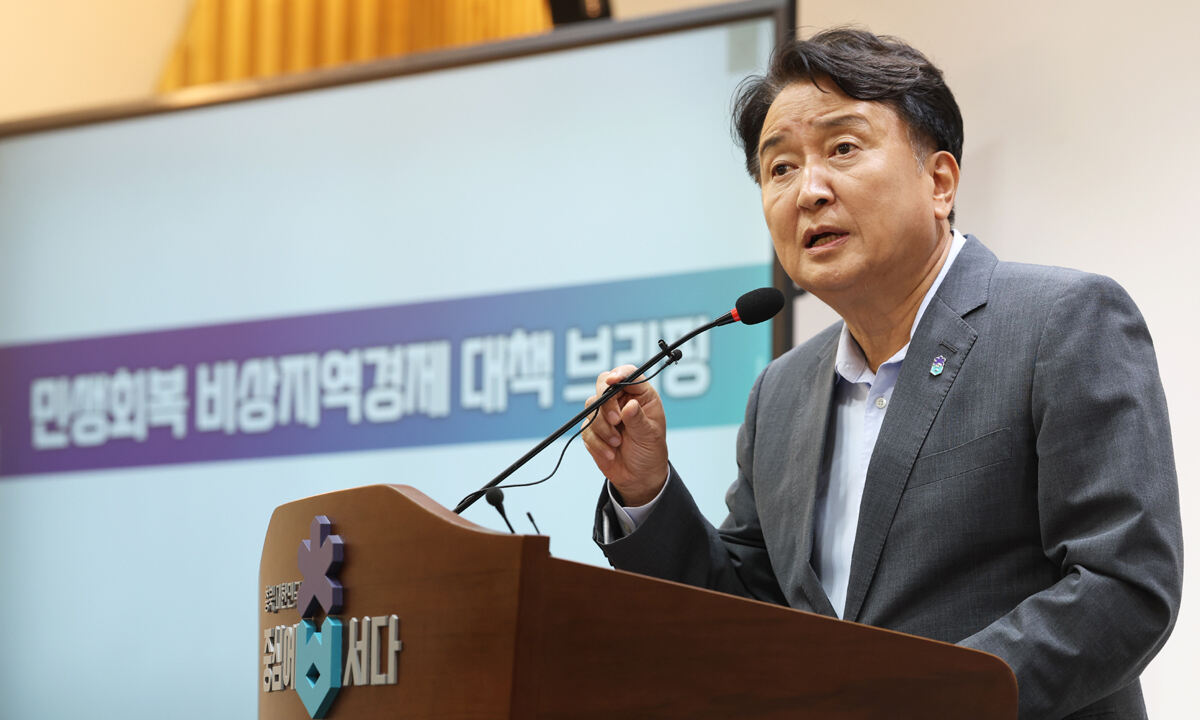 김영환 충북도지사가 21일 도청 브리핑룸에서 ‘민생회복 비상지역경제 대책’을 발표하고 있다. 충북도 제공