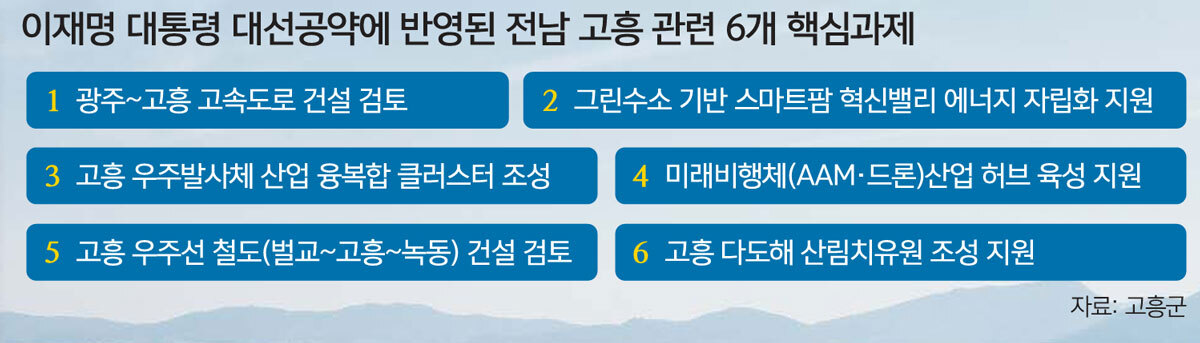 이재명 대통령의 대선공약에 반영된 고흥군 6개 핵심과제는 인구 10만 실현을 위한 전략사업으로 꼽힌다.