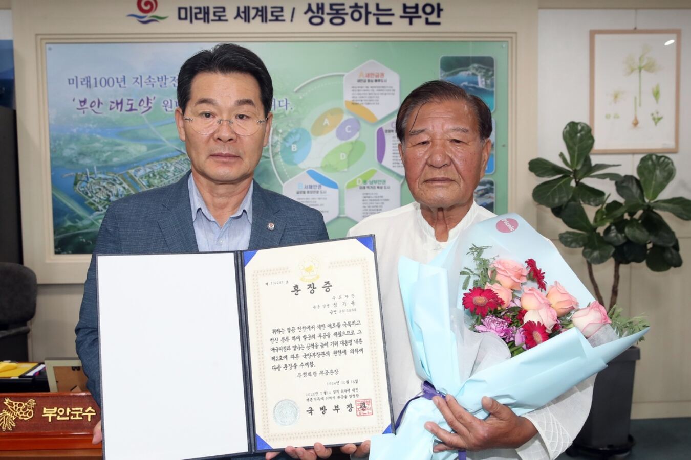 전북 부안군은 14일 고 심기동 상병의 조카 심유섭(77)씨에게 화랑무공훈장을 전수했다. 이번 전수식은 국방부와 육군이 2019년부터 지자체와 함께 추진하는 ‘6·25전쟁 무공훈장 찾아주기’ 사업의 일환으로 진행됐다.