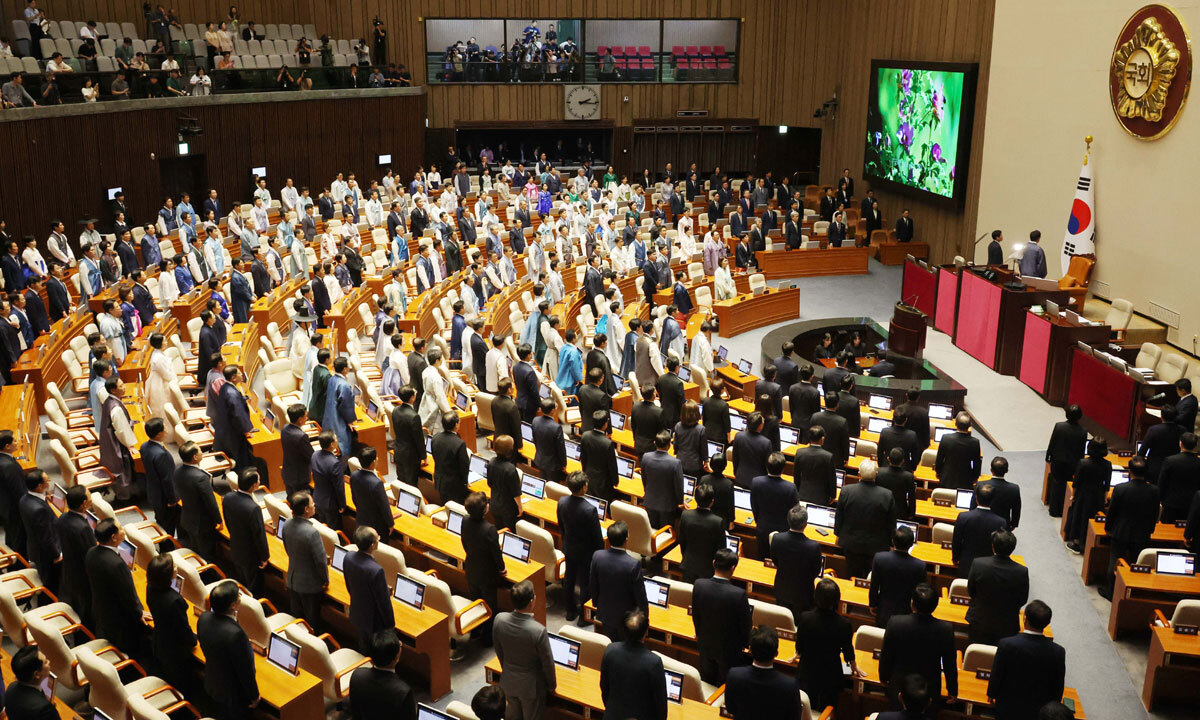 이재명정부의 첫 정기국회가 개막한지 한달이 지났다. 개회일인 지난달 1일 펼쳐진 ‘한복’과 ‘상복’의 진풍경은 상징적이었다. 당시 더불어민주당 의원들은 아시아태평양경제협력체(APEC) 홍보를 위해 형형색색의 한복을 입고 잔치 분위기를 냈다. 반면 국민의힘 의원들은 검은색 상복을 입고 “의회민주주의의 사망”을 외쳤다.