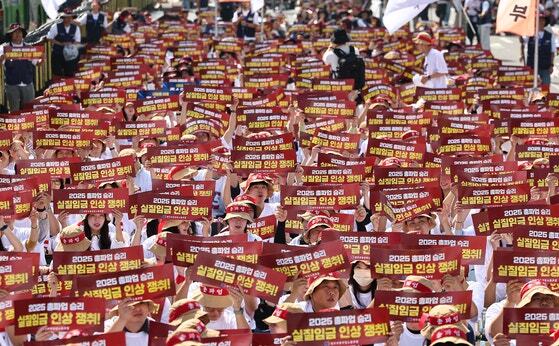 지난달 26일 전국금융산업노동조합의 총파업 대회에 참여한 조합원들이 주 4.5일제, 임금인상 등을 촉구하며 구호를 외치고 있다. 뉴스1