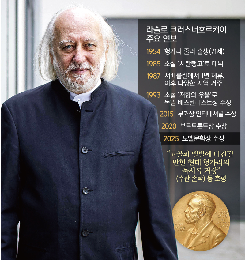 올해 노벨문학상 수상자로 호명된 헝가리 소설가 라슬로 크러스너호르커이(71)는 암울하고 디스토피아적인 이야기를 깊이 있고 통찰력 있는 문장으로 풀어내는 작가로 유명하다. 스웨덴 한림원은 9일(현지시간) 그를 올해의 노벨문학상 수상자로 선정하면서 ‘종말론적 두려움 속에서도 예술의 힘을 재확인하는 강렬하고 선구적인 작품’을 그 선정 사유로 밝히기도 했다.