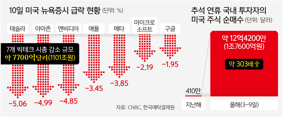 연휴 기간 미국 주식을 대거 매수한 ‘서학개미’도 타격을 받게 됐다. 한국예탁결제원 세이브로에 따르면 3일부터 9일까지 국내 투자자의 미국 주식 순매수 금액은 12억4200만달러(약 1조7600억원)에 달했다. 지난해 추석 연휴(9월14∼18일·410만달러)보다 약 303배 증가한 수치다. 국내 증시가 장기간 휴장에 들어서자 투자 심리가 미국 증시로 옮겨간 것으로 풀이된다. 이 기간 국내 투자자들이 가장 많이 순매수한 종목은 테슬라 주가를 2배로 추종하는 ETF ‘디렉시온 데일리 테슬라 불 2X’로 1억5100만달러가 몰렸다.
