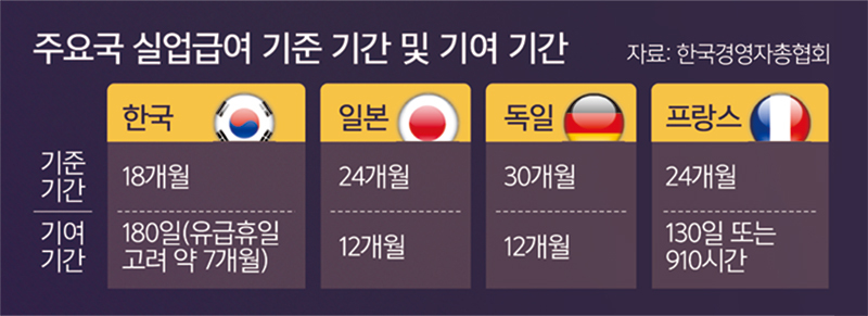 현재 실업급여 제도는 기준 기간 18개월 중 180일만 근무하면 수급 자격이 생긴다. 수급 횟수나 금액에 제한은 없다. 독일과 일본 모두 근무 기간을 12개월로 둬 약 7개월(180일)인 한국보다 길다.