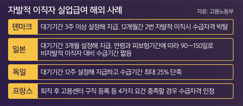 일본은 비자발적 이직자는 최대 330일간 지급하지만, 자발적 퇴직자에게는 이보다 적은 90∼150일간 지급한다. 독일은 자발적 퇴직자는 4분의 1을 단축한 기간 동안 지급한다. 덴마크는 12개월간 두 번 자발적 이직을 할 때는 수급자격을 박탈하는 조건이 있다.