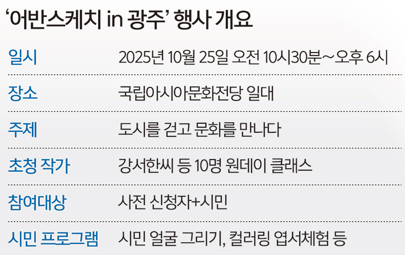 전국 어반스케쳐스(Urban Sketchers·특정 도시, 마을 현장에서 스케치를 담는 사람들)의 축제인 ‘2025 어반스케치 in(인) 광주’가 25일 광주 동구 국립아시아문화전당 일대에서 열린다.