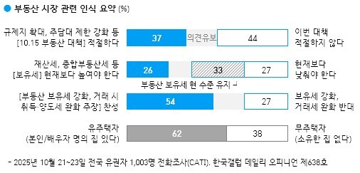 이재명 정부의 10·15 부동산 대책을 놓고 '적절하다'는 긍정평가는 37%, '적절하지 않다'는 부정평가는 44%라는 여론조사 결과가 24일 나왔다.