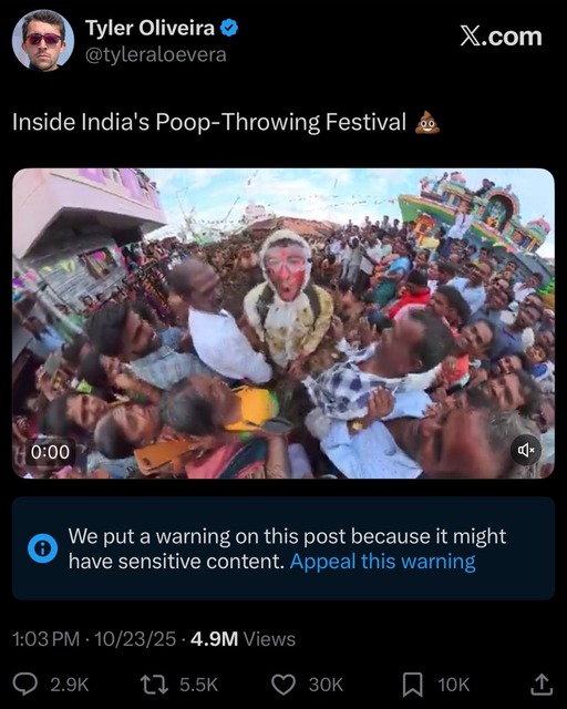 23일(현지시각) 미국인 유튜버 타일러 올리베이라는 소셜미디어 엑스(X·전 트위터)에 '인도의 똥 던지기 축제에서(Inside India's Poop-Throwing Festival)'라는 제목의 글과 영상을 게시했다.