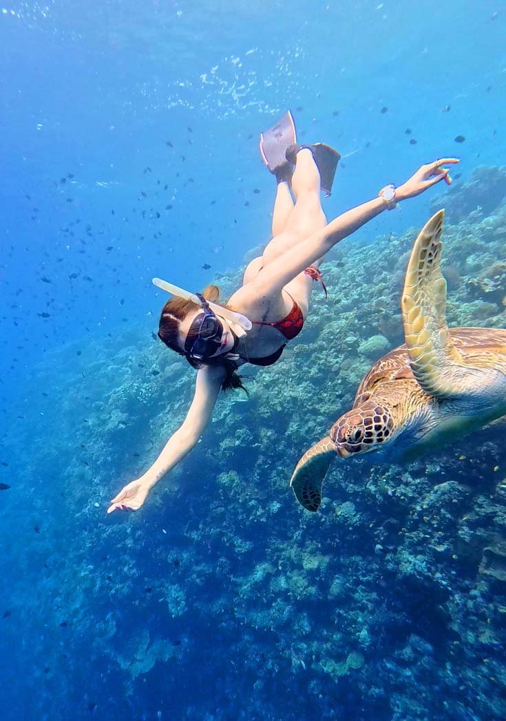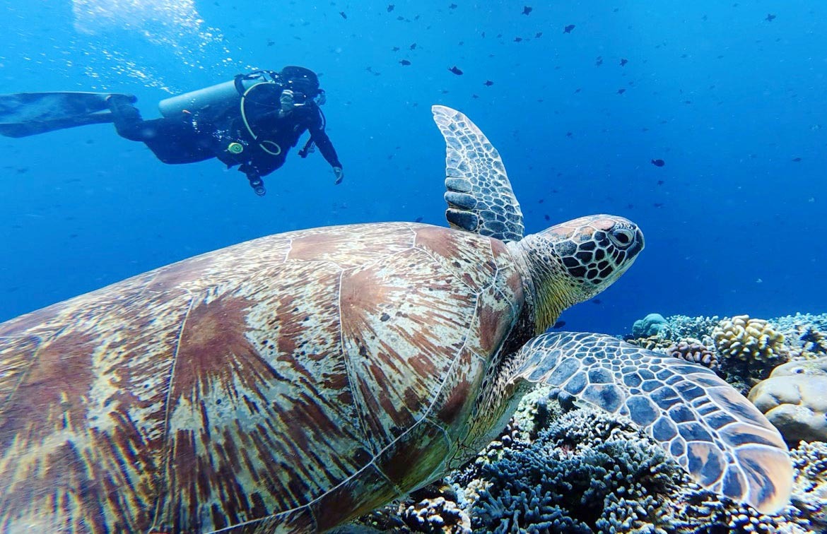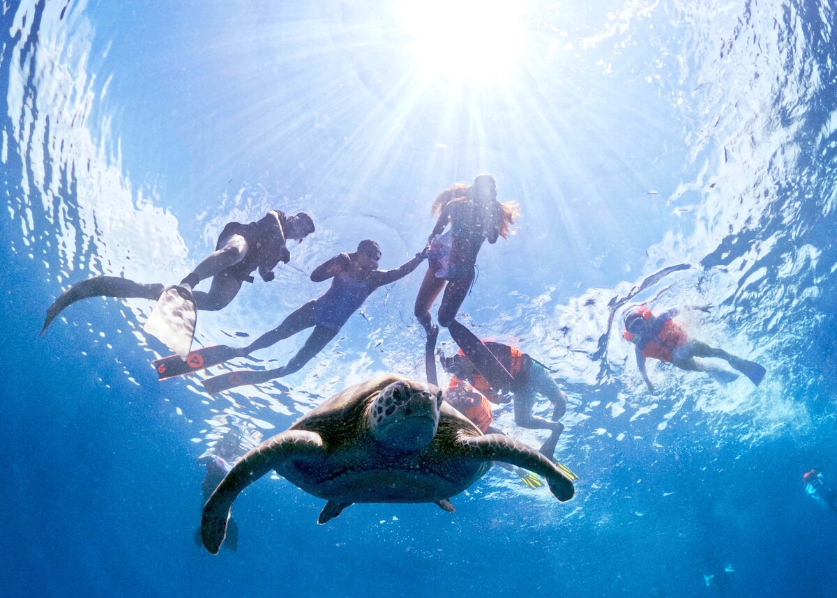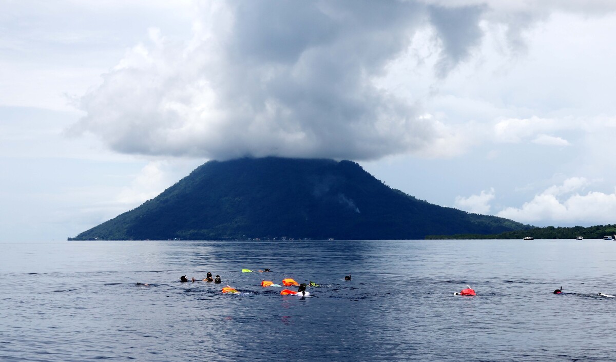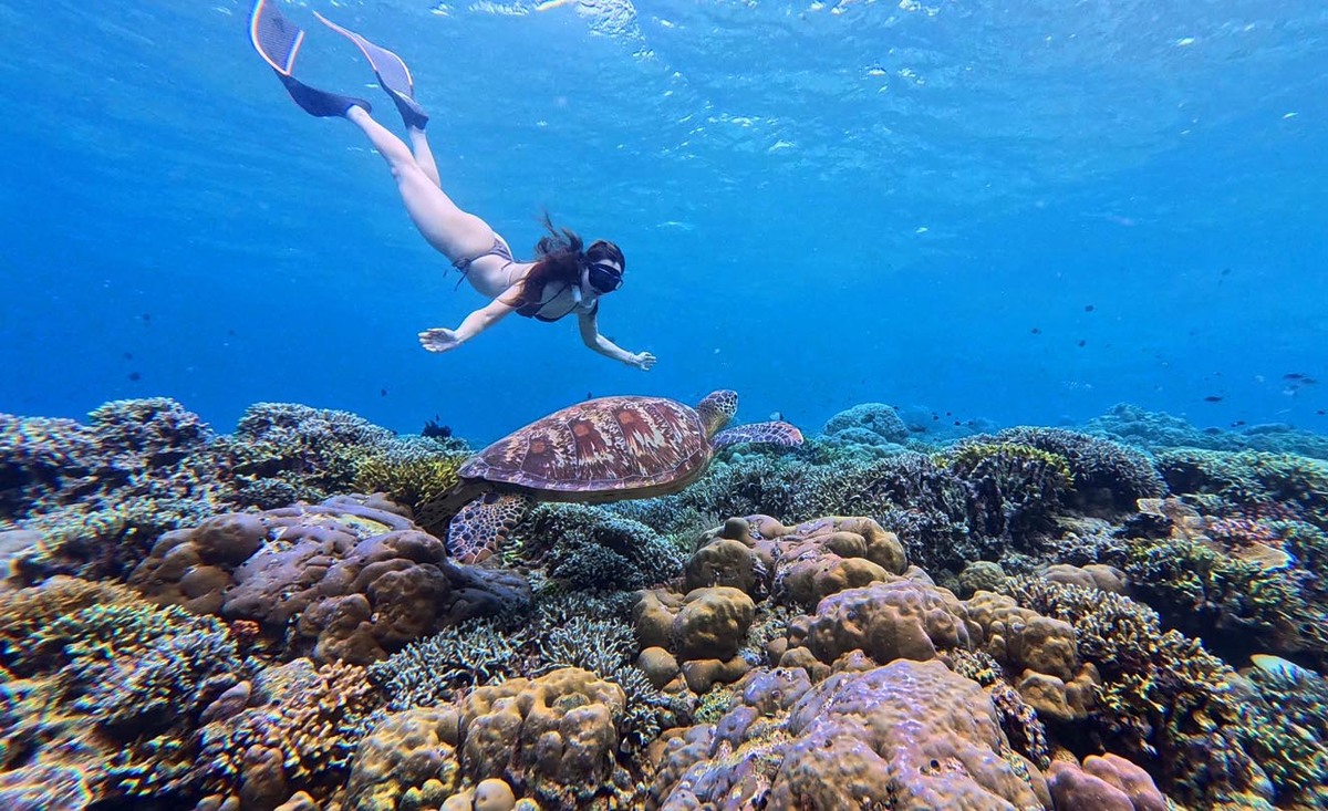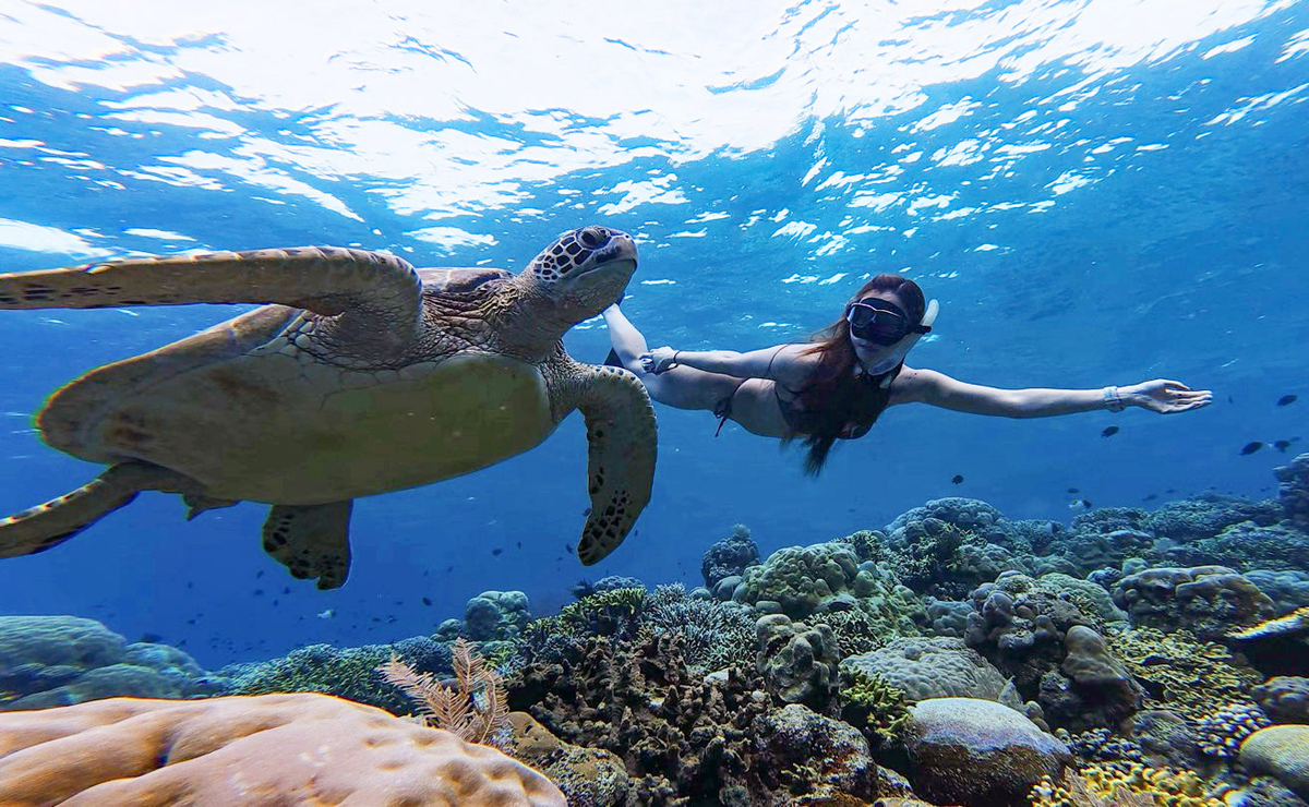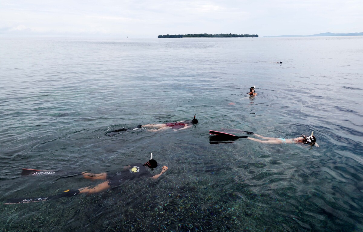 바다거북이의 천국, 지구상 마지막 남은 낙원으로 불리는 '세계 3대 다이빙 성지'인 인도네시아 마나도 부나켄 해양국립공원에서 다이빙과 스노쿨링을 즐기는 관광객들이 바닷속 경이로운 풍경에 환호성을 내지른다.