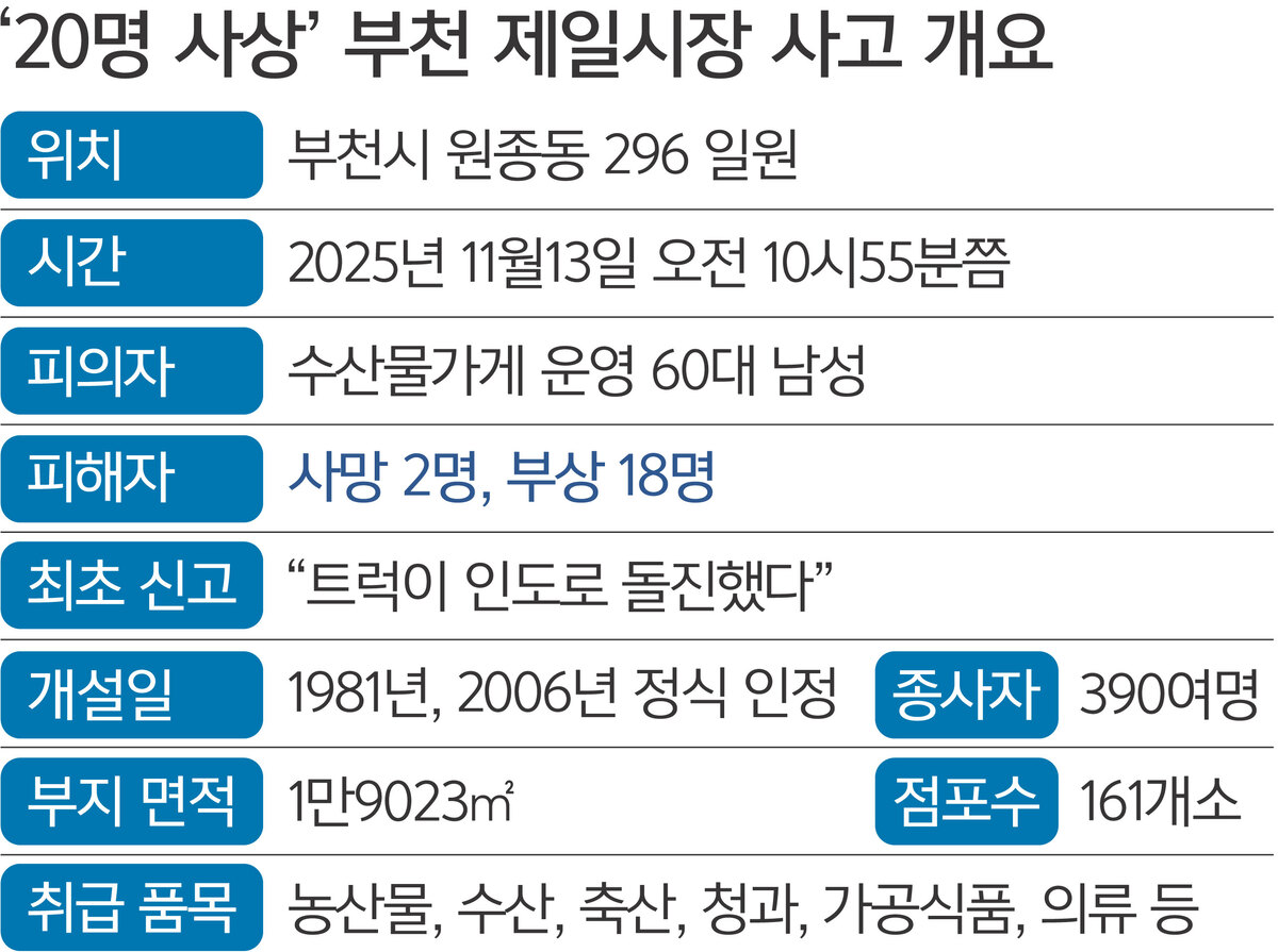 13일 오전 10시55분 경기 부천시 오정구 원종동 제일시장에서 60대 상인 A씨가 몰던 1t 트럭이 인도로 돌진해 60대와 70대 여성 2명이 숨지고 19명이 다쳤다. “트럭이 인도로 돌진했다”는 신고를 받은 소방 당국은 장비 20여대와 대원 60여명을 투입해 구조에 나섰다.