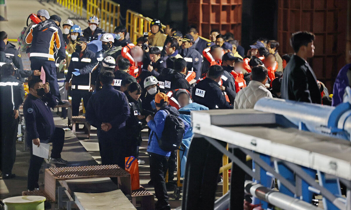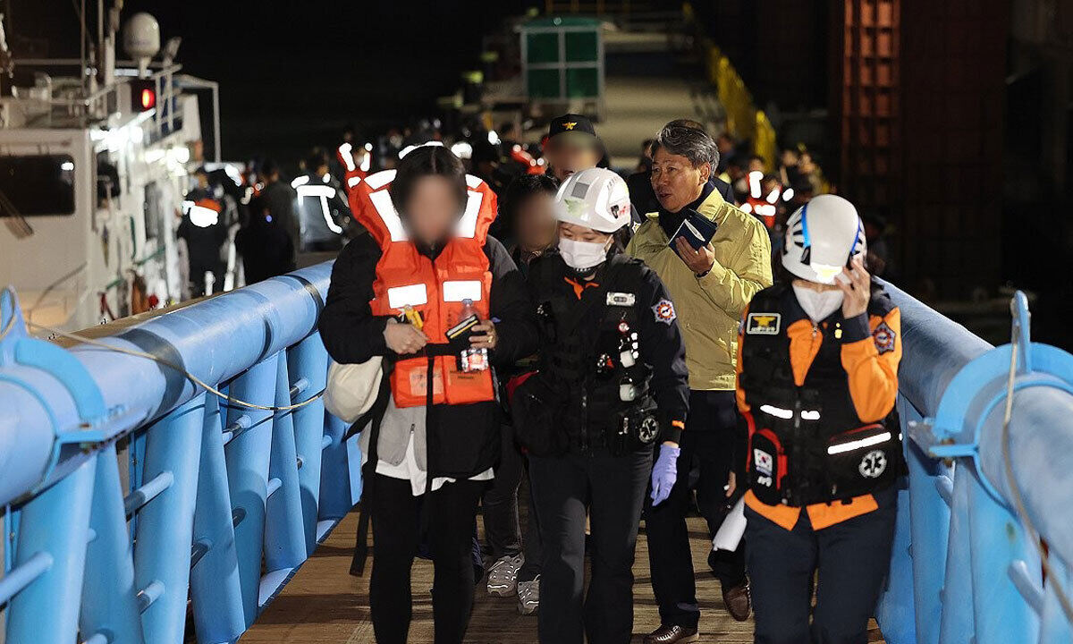 19일 오후 전남 목포시 목포해양경찰서 전용 부두로 여객선 퀸제누비아2호 탑승객들이 구조돼 이동하고 있다. 연합뉴스