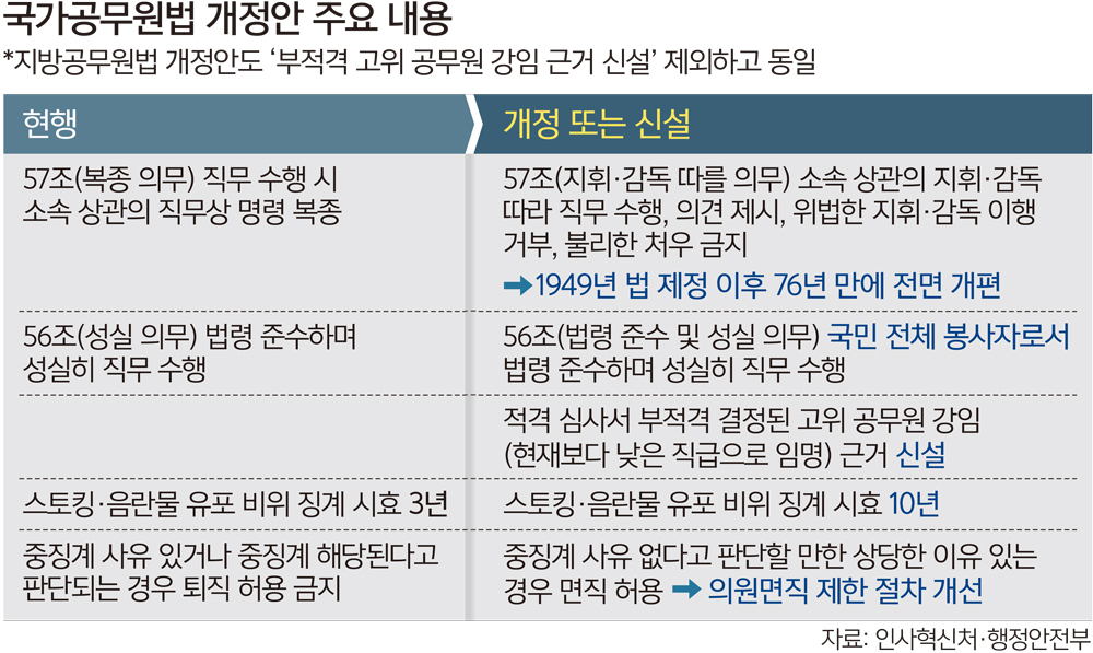 이런 내용들은 지방공무원법 개정안도 같다. 다만 국가공무원법 개정안엔 적격 심사에서 부적격 결정된 고위 공무원을 본인 동의 없이 강임, 즉 현재보다 낮은 직급으로 임명할 수 있는 근거를 신설하는 내용이 추가됐다.