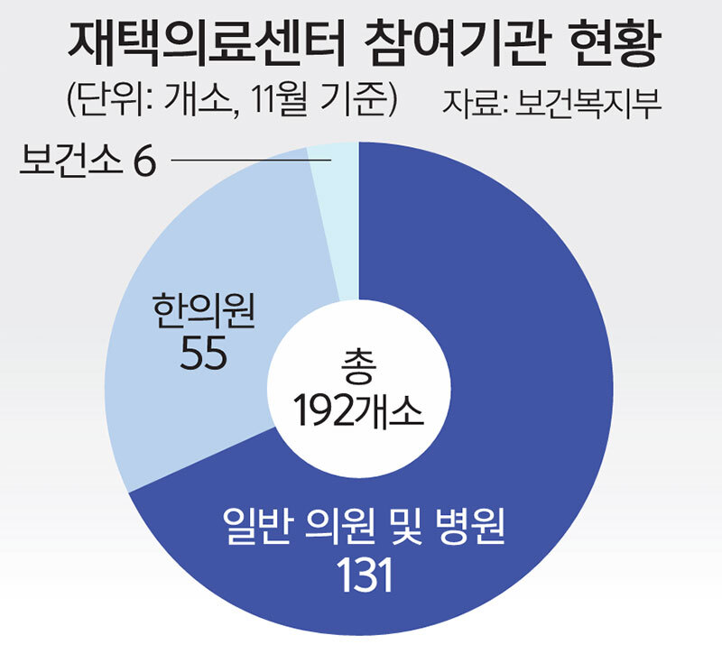 1일 보건복지부 ‘장기요양 재택의료센터 시범사업 참여기관’ 자료에 따르면 올해 11월 기준 전국에 지정된 재택의료센터 192개소 중 한의원이 55개소로 28.6%에 달하는 것으로 나타났다.