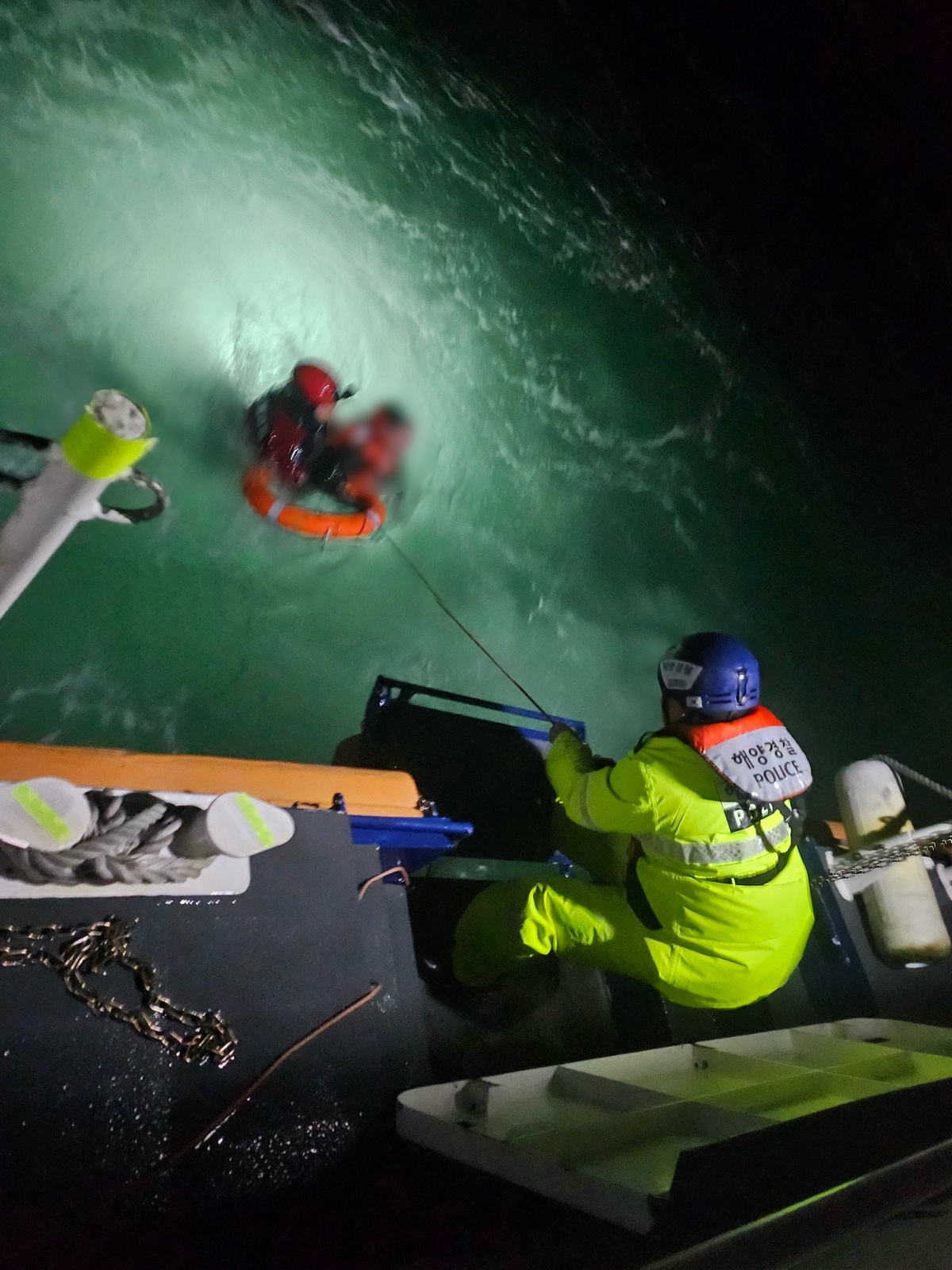 물에 빠져 표류 중인 승선원을 해경이 구조하고 있다. 태안해경