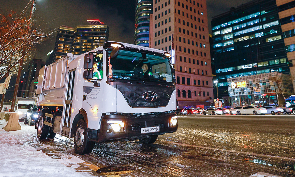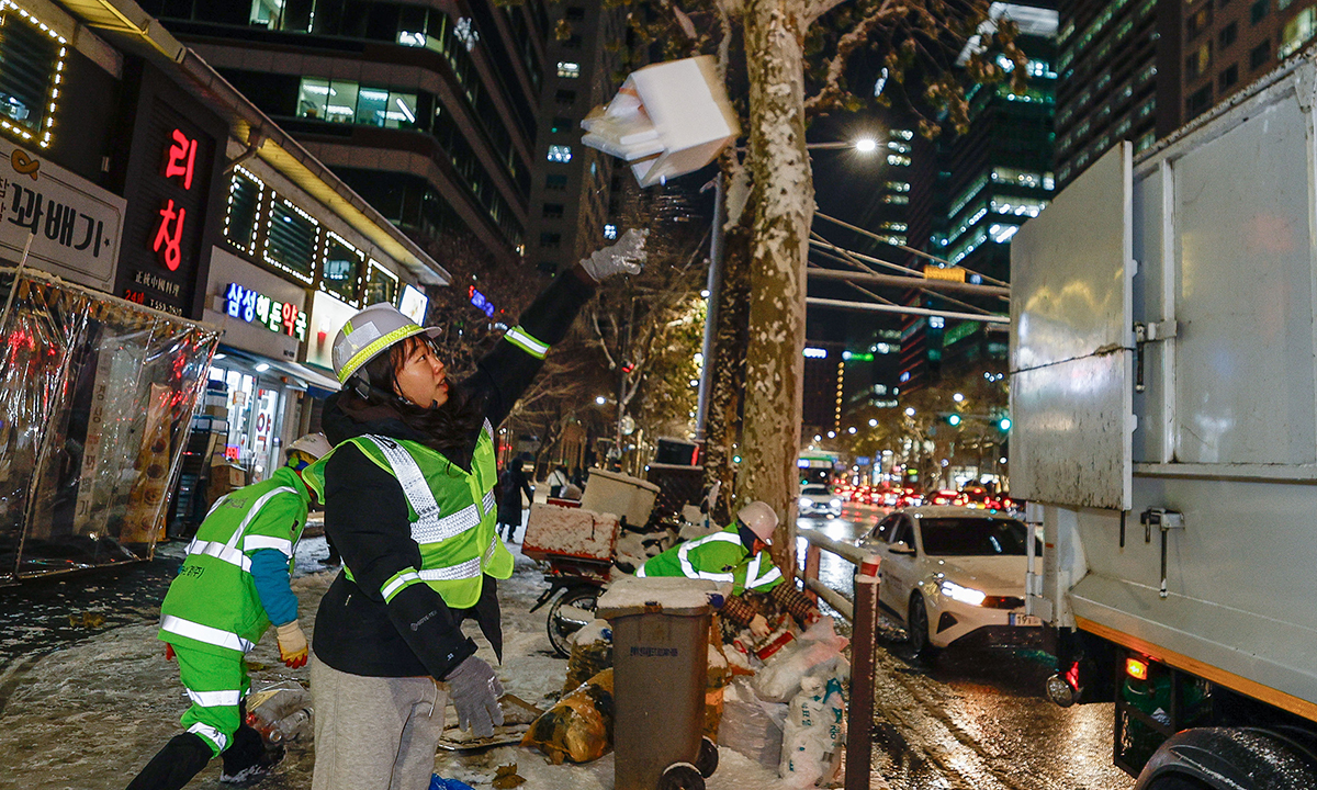 서울에 첫눈이 내린 지난 4일 오후 8시40분. 강남구에 영하 10도의 바람이 불었다. 눈으로 질척해진 봉은사로 8차선 도로 위로 차량이 길게 늘어서 있다. 차로 5분 거리인 강남구청역에서 코엑스 앞까지 그날 밤은 30분이 걸렸다. 나씨와 이씨는 청소차 뒤편까지 걸어가 쓰레기를 실을 여유가 없다. 작업 시간을 줄이기 위해 쓰레기를 어깨 위로 던지는 일을 반복했다.