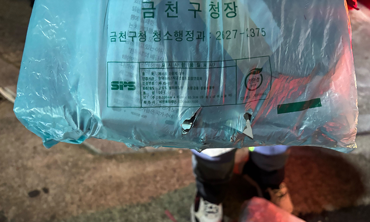 신씨는 깨진 거울 파편이 튀어나온 파란 종량제 봉투를 보여주며 “이런 유리에 찢어지는 것”이라고 말했다. 봉투 표면을 찢고 나온 날카로운 유리 조각이 가로등 빛에 반짝거렸다. 다른 골목에서는 기자가 집어 든 봉투의 매듭에서 무언가가 손등을 긁었다. 집은 봉투를 자세히 들여다보자 검은색 하이힐의 10㎝가량 뾰족한 스틸레토 굽이 종량제 봉투 매듭을 뚫고 튀어나와 있었다.