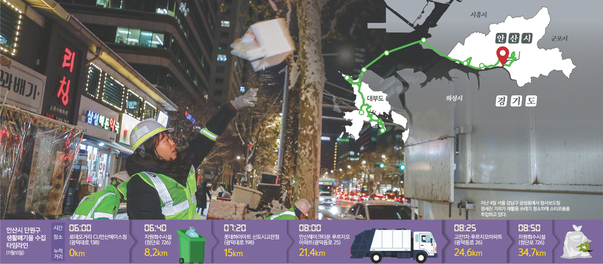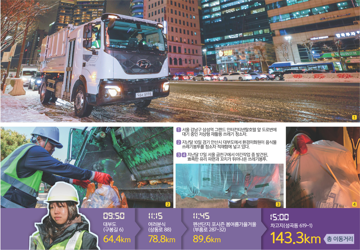 취재팀은 하루 8시간씩 총 6일 환경미화원 작업 현장에 동행했다. 서울 강남구·금천구, 경기 안산시에서 일하는 대행업체 소속 15명의 환경미화원과 동행 취재한 결과, 이들은 하루 평균 85.8㎞를 이동하고 2만8053보를 걸으며 작업하고 있었다.