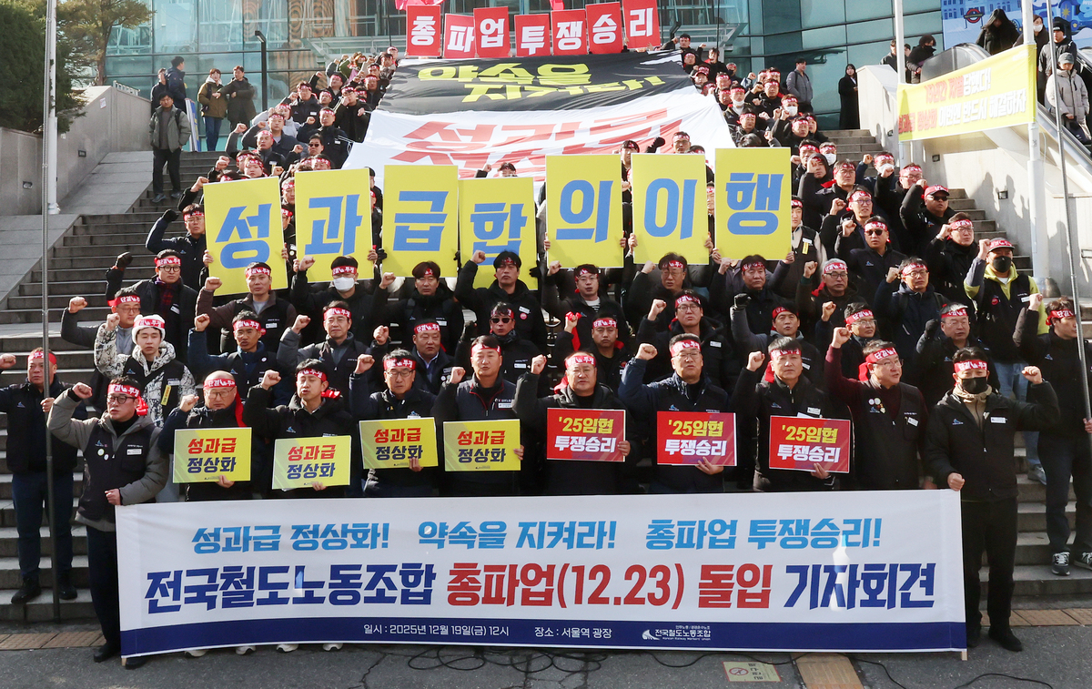 철도노조는 19일 서울역 동쪽 광장 계단에서 기자회견을 열고 정부가 ‘성과급 정상화’ 합의를 파기했다고 주장하며 총파업 돌입을 예고했다. 총파업은 이달 23일 오전 9시부터 무기한으로 진행할 방침이다.