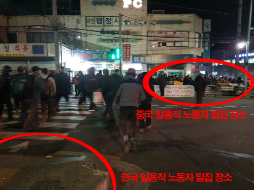 ◆ 중국X한국…두 갈래로 나뉜 인력시장 4시 반쯤 남구로역 일대는 일거리를 구하기 위해 찾아온 사람들로 북적였다. 족히 500명은 넘어 보였다. 남구로역 인력시장은 중국인 일용직 노동자가 모인 지역과 한국인 일용직 노동자가 모인 지역으로 나뉜다. 하나은행이 위치한 거리에는 중국인 노동자가 모여 있고 맞은편 횡단보도를 건너면 한국인 노동자가 모여 있었다. 중국인 노동자들은 한국어를 못 하는 이들이 상당수다. 기자가 다가가 “한국어 할 줄 아세요?”라고 물으면 고개를 저으며 대부분 자리를 피했다. 중국 위례출신으로 15년 전 한국에 귀화했다는 이모(48)씨는 “올해 들어 중국인들이 정말 많아졌다”고 했다. 이씨는 “여기 모인 중국인 상당수가 비자가 없는 불법체류자거나 여행 비자를 통해 한국을 방문한 이들”이라고 주장했다. 그는 “중국에서도 가난한 사람들이 많이 온다”면서 “이들이 인력시장을 메우다 보니 인건비는 오르지 않고 한국인들 설 자리는 점점 줄고 있다”고 토로했다. 중국인은 잡일을 하는 ‘일반공’도 있지만 상당수가 목재를 다루는 ‘목수’일을 하고 있다. 목수는 일반공에 비해 힘들지만 일당이 3~4만원정도 더 높다. 일반공은 대부분 하루 일당 12만원 가량을 받는데 목수는 15~16만원을 받을 수 있다. 이들은 모두 큰 가방을 메고 있었는데 그 안에는 현장에서 쓸 연장이 가득 담겨 있었다. 이를 위해 중국인 노동자가 모여 있는 거리에는 연장과 장갑 등을 판매하는 상인까지 있었다. 인근 A 인력사무소 관계자는 “이곳에 모인 목수 쪽 일용직 90%가 중국인인데 이들이 좋아서 쓴다기보다 한국인 중에 하려는 사람이 없어서 쓸 수밖에 없다”고 설명했다. 60대라고 소개한 그는 “우리 때야 돈 되면 다했지...요즘 젊은 사람들이 막일(건설 일용직 노동)을 누가 하려 하나”면서 “여기 한국인들도 막노동을 잠깐 하는 일로 여기고 힘든 기능공보다 비교적 단순한 잡일과 청소를 하는 ‘일반공’을 하려 한다”고 했다. 이날 남구로역에는 중국인, 한국인이 7대 3 정도로 중국인 노동자가 더 많아 보였다.
