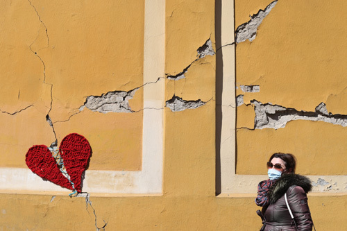 크로아티아 수도 자그레브. 지진으로 금 가고 갈라진 노란색 벽에 누군가 빨간색 털실로 뜨개질하여 하트 모양을 수놓았다. 마스크를 쓴 이 여성에게 잠시나마 위로가 됐을까. 전 세계 뉴스가 온통 코로나19 얘기 일색이다. 이탈리아처럼 피해가 극심한 지역은 뉴스의 초점이 되지만 그렇지 않은 국가는 관심권에서 멀어진다.