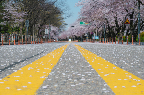 도로의 본질은 ‘이음’이다. 매년 이맘때면 만개한 벚꽃으로 사람과 봄을 이어주던 윤중로가 폐쇄됐다. 코로나19의 영향이다. 발길이 끊어진 회색 아스팔트 길 위로 꽃비가 내렸다. 한 번도 만나본 적 없는 세상의 낯선 풍경이다. 텅 빈 꽃길에도 여전히 봄기운은 서려 있었다. 이 봄이 지고 나면 다시 열릴 이 길에선 또 무엇과 무엇이 이어질까.