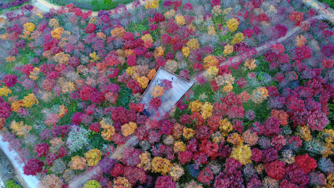 전남 화순군 만연산 수만리 생태숲공원을 드론으로 하늘에서 내려다보니 마치 한 폭의 가을 수채화 그림을 보는듯 하다.