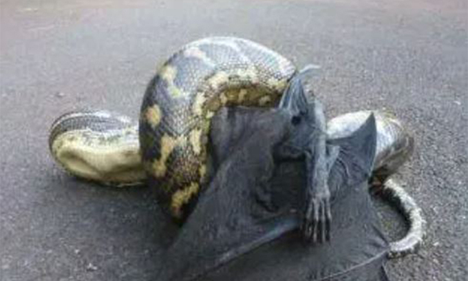 현관문을 나서자마자 이러한 장면을 목격한다면 분명 충격이 클 것이다. 여우 박쥐는 167㎝까지 자라기도 하지만, 뱀을 쫓아내기에는 역부족이다.