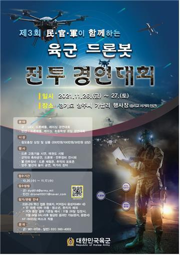육군 드론봇 전투체계 구축과 지역경제 활성화 등을 목표로 열리는 이 대회에서 종목별 1~3위 팀은 육군 참모총장과 1군단장이 수여하는 상장과 상금을 받는다.