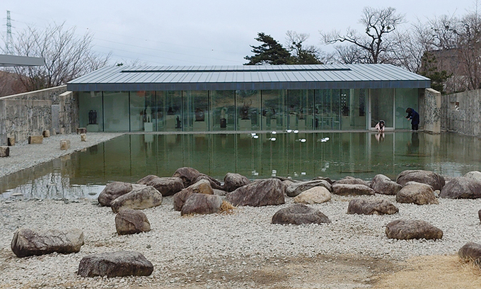 두 번째 매력은 조각과 건축이 상호보완을 이루는 장면이다. 바우지움미술관은 2015년 현대 조각의 대중화와 발전을 위해 치과의사 안정모 박사와 조각가 김명숙 관장 부부가 건립한 사립미술관이다. 당연히 미술관에는 조각 작품만 전시돼 있다. 조각은 회화와 달리 벽에 종속되지 않고 전시될 수 있다. 그래서 조각을 위한 미술관에서 벽은 회화를 위한 미술관과 달리 흰색일 필요도 없고 심지어 막혀 있지 않아도 된다.