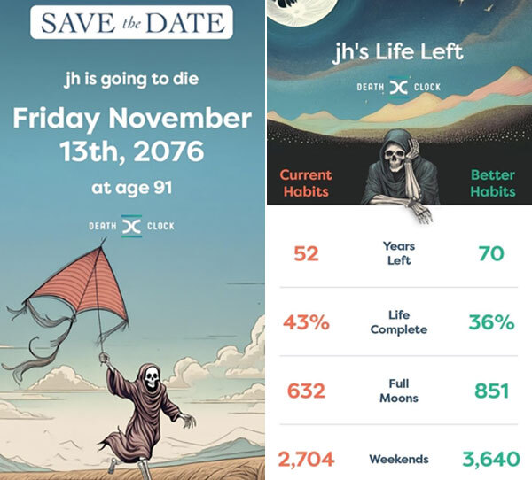 인공지능(AI)을 기반으로 사망 날짜를 알려준다는 모바일 애플리케이션(앱) '데스클락'(death clock)은 4일 기준, 내가 세상에서 떠나는 날을 이렇게 예측했다.