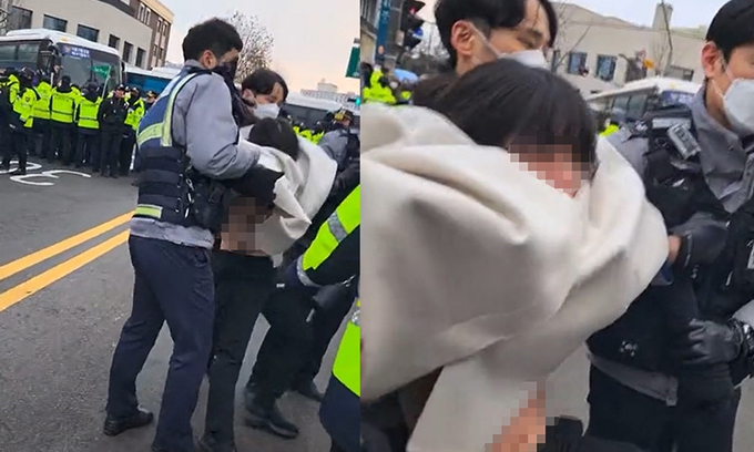 영상을 보면 흰색 재킷을 입은 지지자는 경찰에 양팔이 연행된 채 끌려갔다. 한 손에 쇠 지렛대를 든 이 지지자는 끌려가지 않으려 다리에 힘을 주고 버텼고 발버둥 치기도 했다.