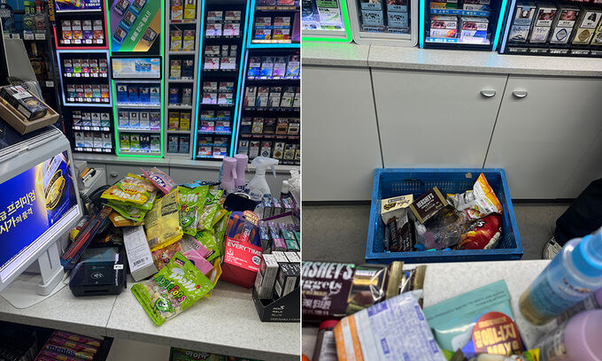 A씨는 물건을 원래 자리에 놓아달라는 편의점 직원의 말에 돌변해 시비를 걸기 시작했다. 당시 편의점 근무자였던 이도윤(23)씨는 “계산대에 물건을 두고 계산하지 않고 바깥으로 나갔다”며 “옆에 있던 동료가 계산 안 하실 거면 원래 자리로 가져다 놓으라고 했더니 욕하며 윗옷을 벗었다. 등 전체에 옛날 건달이 하는 것 같은 문신이 있었다”고 말했다.