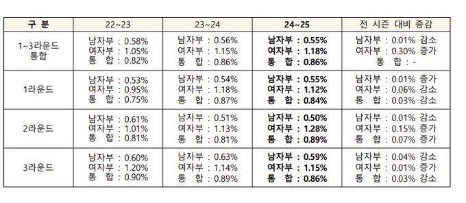 올 시즌에도 남녀부의 격차는 뚜렷하다. KOVO가 전반기를 마치고 발표한 자료에 따르면 남자부 1~3라운드 통합 시청률은 0.55%, 여자부 1.18%로 두 배가 넘는다. 이 때문에 KBSN스포츠와 SBS스포츠도 남녀부를 번갈아 중계하지만, 여자부 경기를 생중계를 하지 못한 방송사도 스튜디오에서 중계영상을 만든 뒤 곧바로 재방송을 틀기도 한다. 여자부 경기는 재방송도 상당한 시청률을 담보하기 때문이다. 남자부는 재방송을 거의 볼 수 없다. 그만큼 남녀 프로배구의 인기는 꽤 크게 벌어져있다. 이 역시 김연경 효과를 부인할 수 없다.