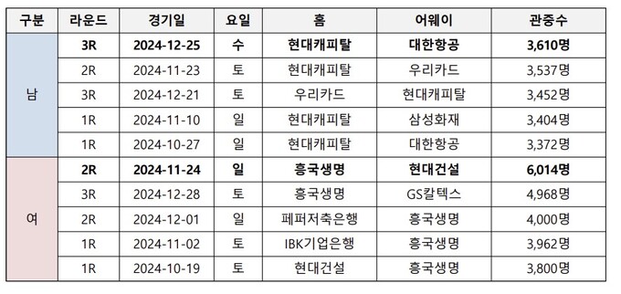 올 시즌 전반기 여자부 시청률 TOP5 중에 3경기가 흥국생명 경기일 정도다. 지난해 11월24일 흥국생명-현대건설전이 1.88%로 1위, 12월17일 흥국생명-정관장전이 1.69%로 2위, 11월20일 정관장-흥국생명전이 1.62%로 5위였다. 여자부 최다 관중 동원 TOP5도 모두 흥국생명의 경기였다. 시청률이나 관중 동원 모두 김연경의 흥국생명이 주도하고 있다.