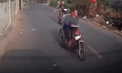 영상에는 헬멧도 없이 함께 오토바이를 타고 달려오던 두 남성이 휠체어를 타고 도로를 이동하던 장애인의 뒤퉁수를 때리는 모습이 포착됐다.