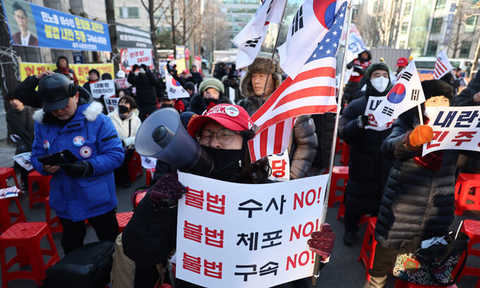 황교안 전 국무총리와 유동규 전 성남도시개발공사 기획본부장이 이끄는 '부정선거부패방지대'는 이날 오전 중앙지법 인근 빌딩 앞에서 윤 대통령 석방을 촉구하는 집회를 개최했다.