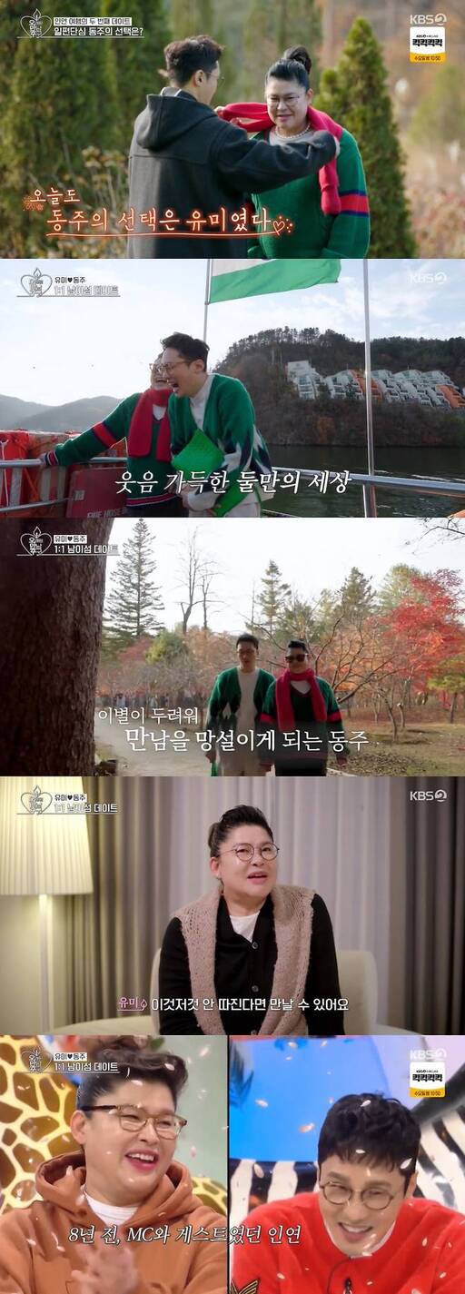 황동주는 "여기 들어오기 전부터 마음의 결정을 하고 있었다"며 데이트 상대로 이영자를 선택했다. 황동주는 이영자 앞에서 서서 "유미야 나랑 데이트 가자"라고 말하며 이영자 목에 목도리를 걸어줬다.