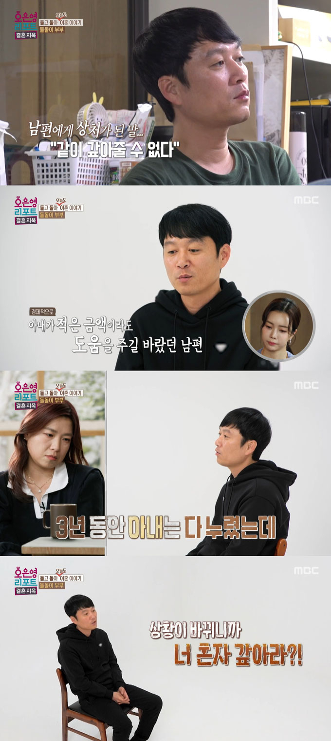 그러나 아내는 "내가 왜 말을 무시하는 줄 아냐. 투자할 때부터 돈 모으라고 했는데 내 말을 안 듣지 않았나. 난 당신 선택을 믿었고, 알아서 하겠거니 내버려 뒀는데 결국 좋진 않았다. 그거 때문에 마음의 조급함이 이어져 온 거 아니냐. 빚이 늘어났기 때문에"라고 말했다.