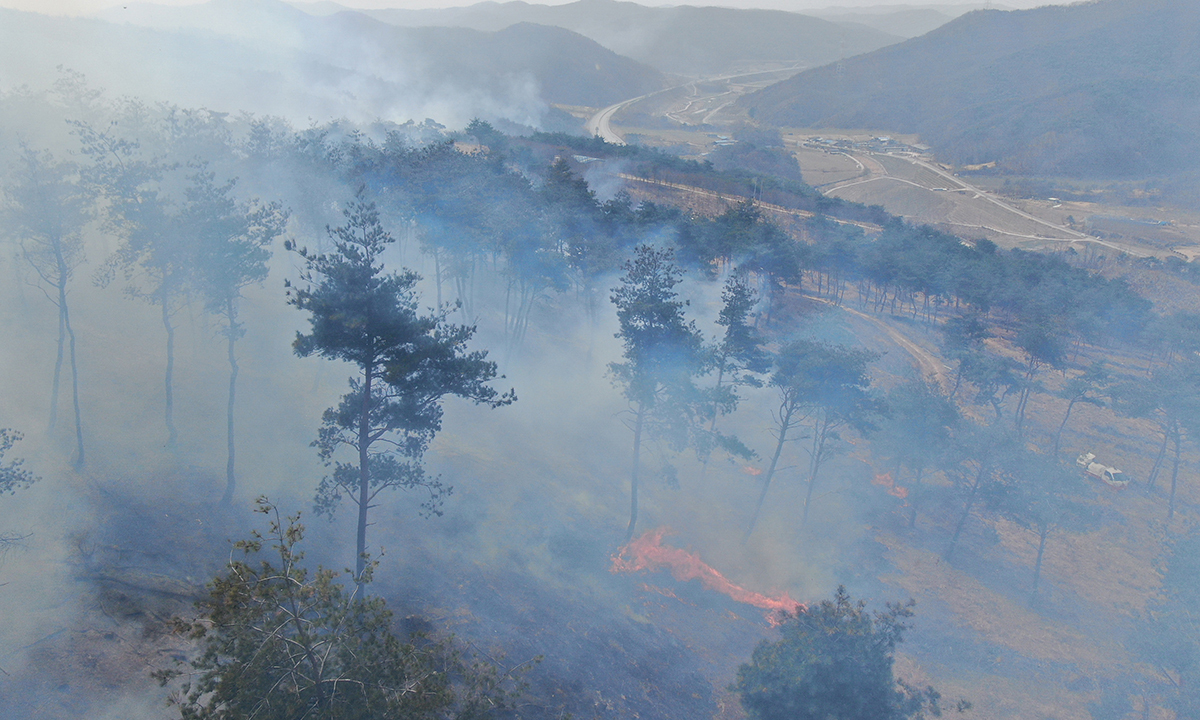 가뜩이나 산불 초기 초속 15m 달하는 강풍으로 초동 진화에 실패한 데 이어 100㎞ 달하는 화선에서 뿜어지는 연무로 진화율은 더딜 뿐만 아니라 헬기 조종사 등 진화인력의 피로도마저 가중돼 공중진화 전력이 한계에 달했다는 지적이다.